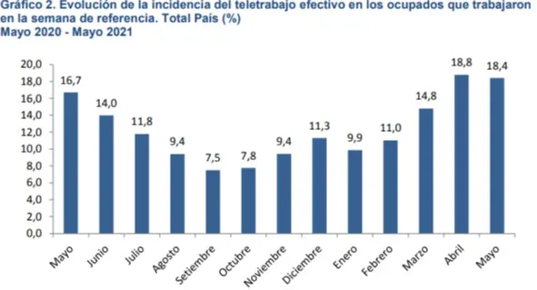 Uno de los indicadores incorporados por el INE desde que apareció la pandemia es la incidencia del teletrabajo efectivo. Para mayo se observó que 18,4% de los ocupados declararon haber realizado teletrabajo en la semana anterior, lo que representa 0,4 puntos porcentuales menos que el mes anterior.