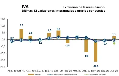 La recaudación del IVA alcanzó los $ 17.762 millones en julio 2020 (47,9% de la recaudación total bruta) y creció 2,2% real tras un trimestre de caídas en la comparación interanual. En los 12 meses a julio, los ingresos del principal tributo del fisco cayeron 0,6%. El pasado mes crecieron tanto el IVA interno (+2,2%) como el IVA sobre las importaciones (+1,8%).