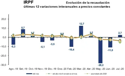 La recaudación del IRAE sumó $ 4.858 millones en julio y creció por segundo mes consecutivo (+1,8%), aunque por debajo del dato de junio (+4,5%). En tanto, los ingresos por IRPF sumaron $ 6.821 millones en julio, con un crecimiento internanual de 2,7%. En este caso, también se dejó atrás un trimestre consecutivo de caída en la recaudación de este tributo que representa el 18,4% de la recaudación bruta de la DGI. El mayor crecimiento se dio en el IRPF categoría I (al capital) con un crecimiento del 14,6% interanual. El IRPF categoría II (al trabajo) apenas se expandió 0,9% en julio respecto a igual mes del año pasado.