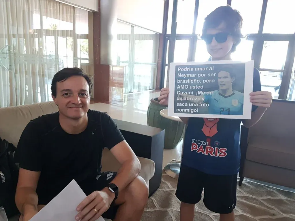 Pero no fue lo único. Lo sorprendente fue la forma en que se saludaron. El chiquilín estaba parado arriba de la reja cuando Cavani, en la partida de la selección uruguaya rumbo a Salvador de Bahía, se arrimó a los hinchas a saludar.