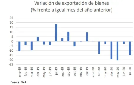 Entre enero y julio el descenso fue de 12,8% frente al mismo lapso del año pasado, con un monto exportado de US$ 3.847,8 millones. En tanto, en los 12 meses finalizados en julio las ventas bajaron 6,6% en comparación con igual período cerrado en julio de 2019.