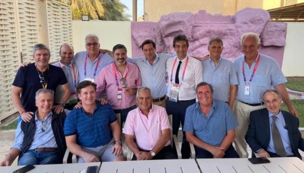Pablo Ferrari abrazado a Ignacio Alonso y con varios dirigentes del fútbol uruguayo en el reciente Mundial Qatar 2022