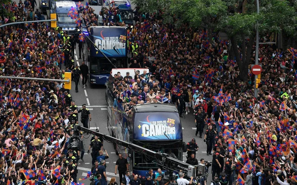 AFP El paso de los autobuses entre la multitud Montados en dos autobuses descubiertos, el Barcelona masculino, y su contraparte femenina, que hace unos días ganó su cuarto campeonato español consecutivo, recorrieron las calles de la capital catalana acompañados por miles de aficionados, que corearon el nombre del técnico Xavi Hernández.