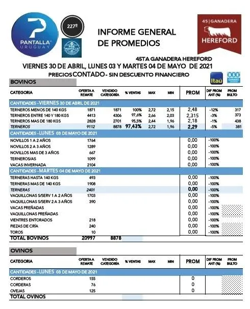 La subasta continuará el lunes 3 y martes 4 de mayo en dos nuevas jornadas con dispersión en ese caso de ovinos, novillos, terneros, terneras, vacas de invernada, vaquillonas sin servicio, vientres preñados, vientres entorados y piezas de cría.