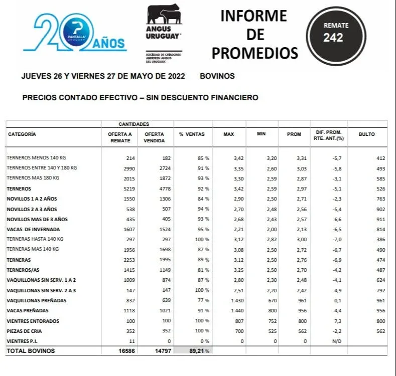 Esta comercialización de Pantalla Uruguay, que fue la N° 242 del consorcio, se desarrolló en dos días, el jueves 26 y viernes 27 de mayo, con una oferta de 16.140 vacunos y 450 ovinos.