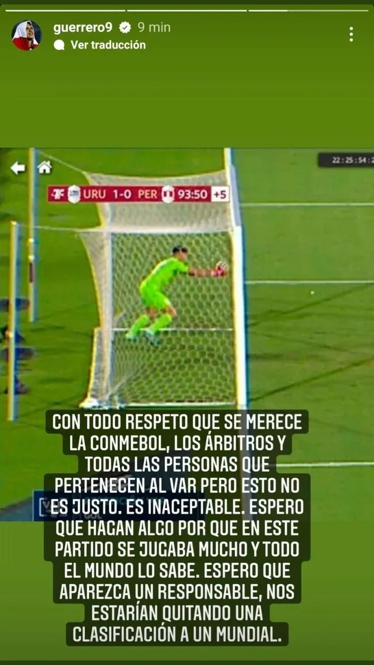 El futbolista que no viajó a Montevideo porque se está recuperando de una lesión en la rodilla, subió una historia en su cuenta oficial de Instagram @guerrero9 apenas terminó el partido en el Estadio Centenario.