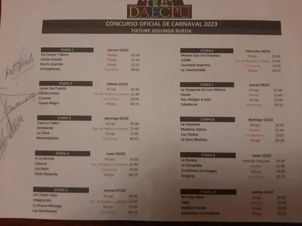 Esto fue informado por Daecpu, la gremial que nuclea a los directores de conjuntos de carnaval, que elaboró el siguiente fixture.