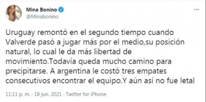 La pareja de Federico Valverde, la periodista argentina Mina Bonino, analizó el partido entre Uruguay y Argentina que terminó con victoria albiceleste por 1-0 en lo que fue el debut celeste en la Copa América.