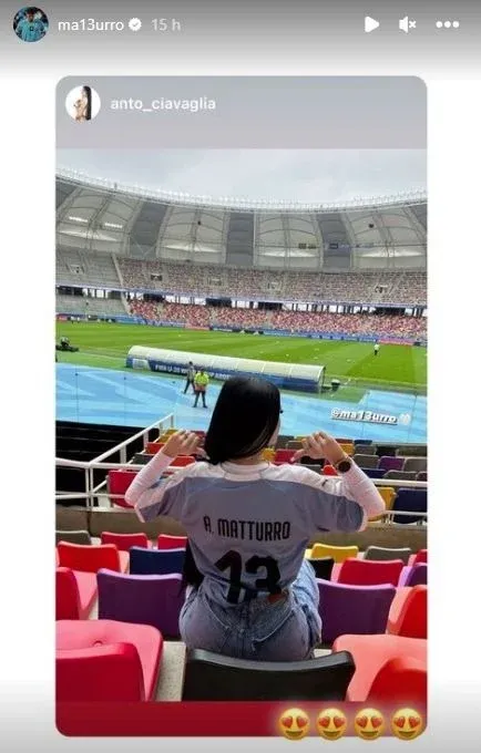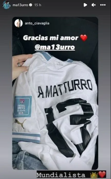 Instagram Anto Ciavaglia en la tribuna “Qué lindo coincidir contigo amor”, respondió Ciavaglia, quien estuvo en la tribuna del Estadio Madre de Ciudades de Santiago del Estero con una camiseta de Matturro y que tras el partido recibió la casaca blanca del zaguero de regalo. “Gracias mi amor”, le escribió.