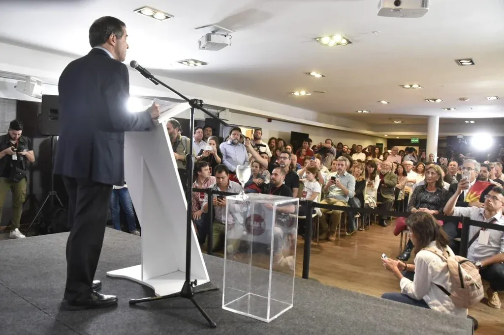 Mientras esto ocurría, Talvi de corbata bordó y lentes, repasaba minuciosamente un discurso que había terminado de pulir minutos atrás. Aspiraba a que fuera breve y potente. A las 21:11, bajó del ascensor y caminó sonriente entre los flashes hacia la sala de conferencia.