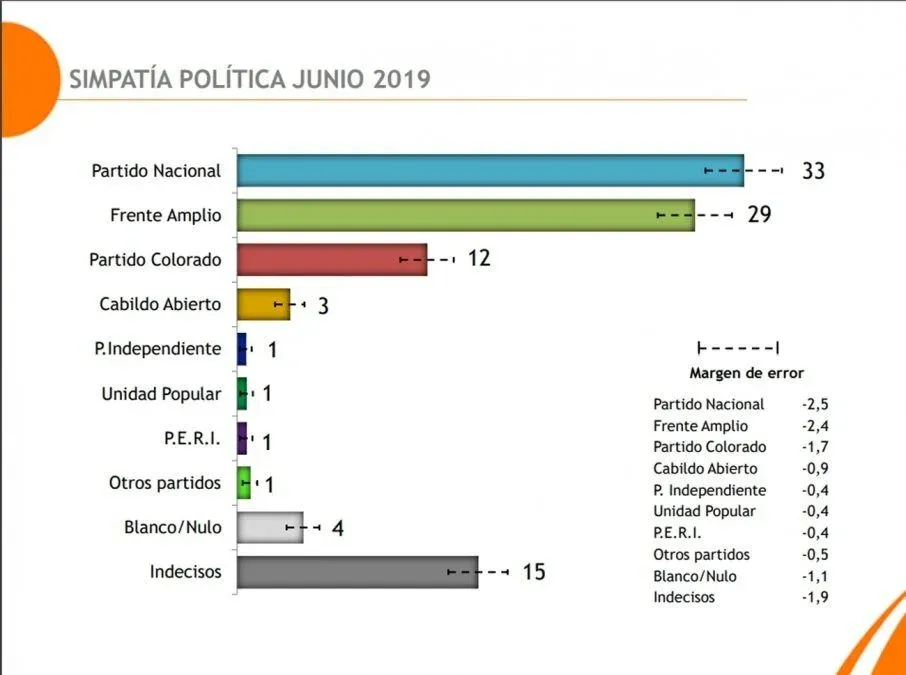 En la anterior medición de Equipos sobre intención de voto, presentada el 14 de mayo, los blancos lideraban con 32%, seguidos del Frente Amplio con 30% y el Partido Nacional con 13%.