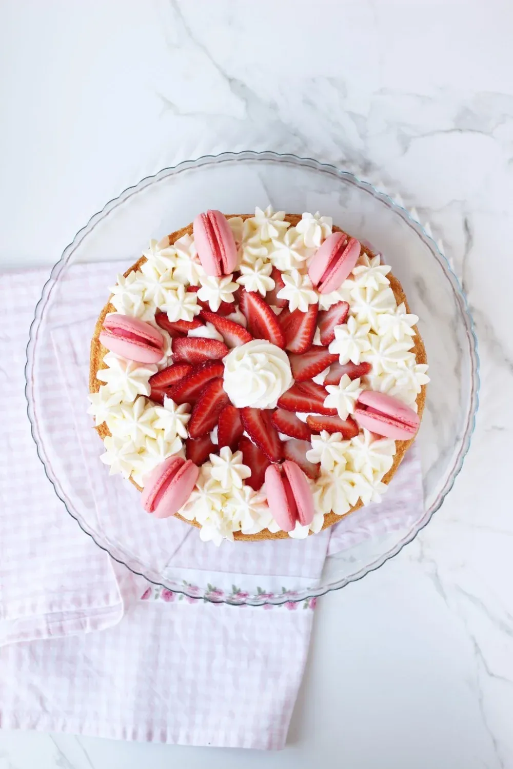 Una vez en la fuente, untar la superficie con un poco de crema chantilly. Decorar con las frutillas reservadas (en fetas, enteras, en mitades, como quieran) y terminar con copetes de crema. Terminar con los macarons y refrigerar hasta el momento de servir.