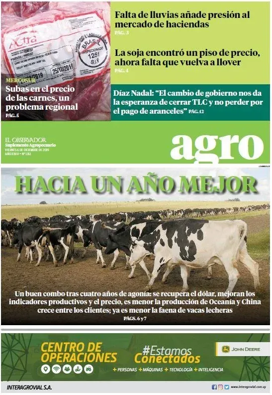 En este cambio de año, la secuencia que se adjunta exhibe a una tapa de El Observador Agropecuario por cada mes de 2019, a modo de síntesis de temas clave que fueron considerados durante el ejercicio.