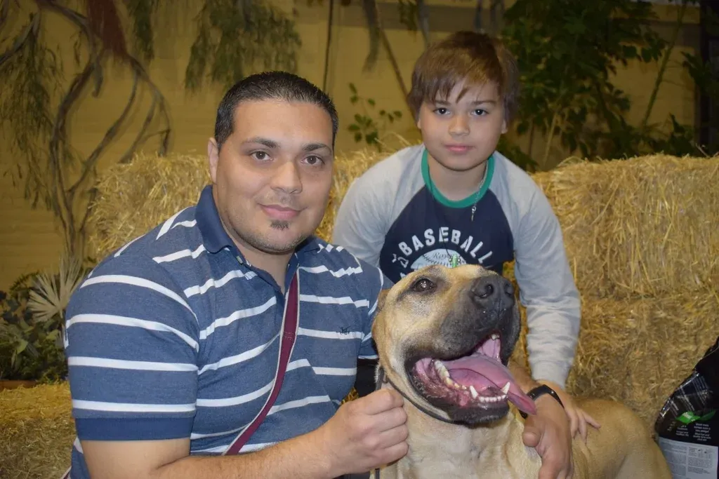 Juan Samuelle Joaquín Díaz, Maia Elgue, el handler Marcelo Vallejo y Sebastián Díaz. “Patrón vive en una típica casa de familia, convive con mi hijo de 10 años, lo llevamos a la feria y no pasa nada, es excelente de temperamento, si está en casa y viene alguien ladra, avisa y si lo dejamos pasar lo acepta, pero si quiere ingresar sin estar autorizado la va a pasar mal”, contó.