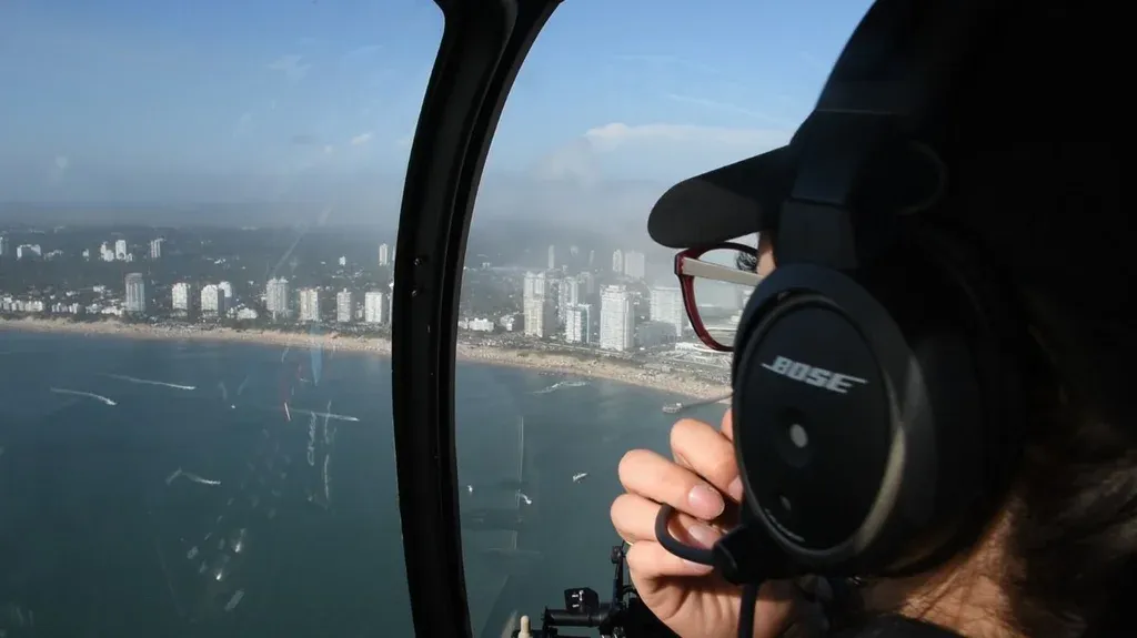 Se escucha el sonido del sintonizador de radio por los auriculares del helicóptero que este domingo a las 16:53 despegó del aeropuerto El Jagüel, ubicado en Maldonado, para patrullar en Punta del Este y las zonas contiguas.