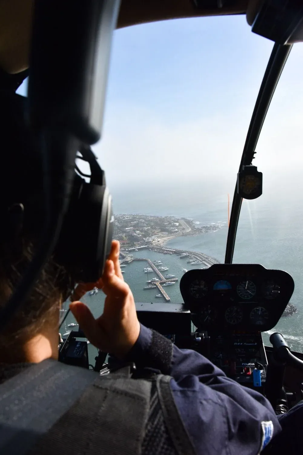 El helicóptero de la Policía comienza a sobrevolar la costa de Punta del Este y a esa hora de la tarde se ve a las personas y a las sombrillas distanciadas. Es fácil ver las posibles aglomeraciones, pero también se ve con detalle lo que sucede en los campos, en las casas y adentro del mar porque la aeronave va a una velocidad lenta, con el tiempo justo para entender lo que está pasando allá abajo. La efectiva dice que incluso se puede volar más bajo en situaciones que lo ameriten.