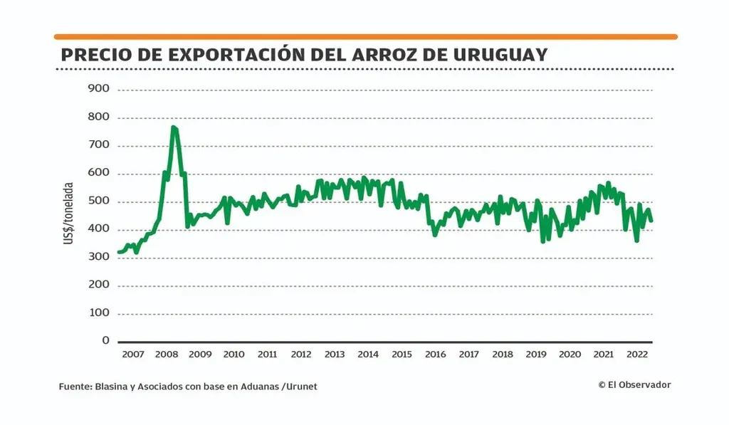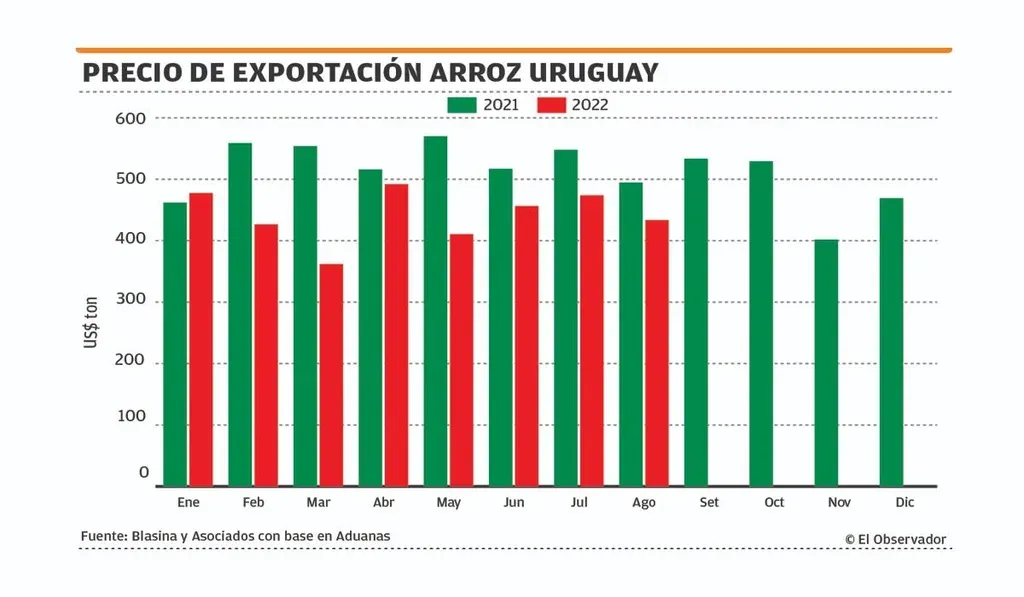 Además, por ahora el precio de exportación 2022 es menor a 2021. “A igualdad de producto es 17% menos de precio en arroz elaborado, de US$ 606 a US$ 503 el arroz elaborado”, comentó.