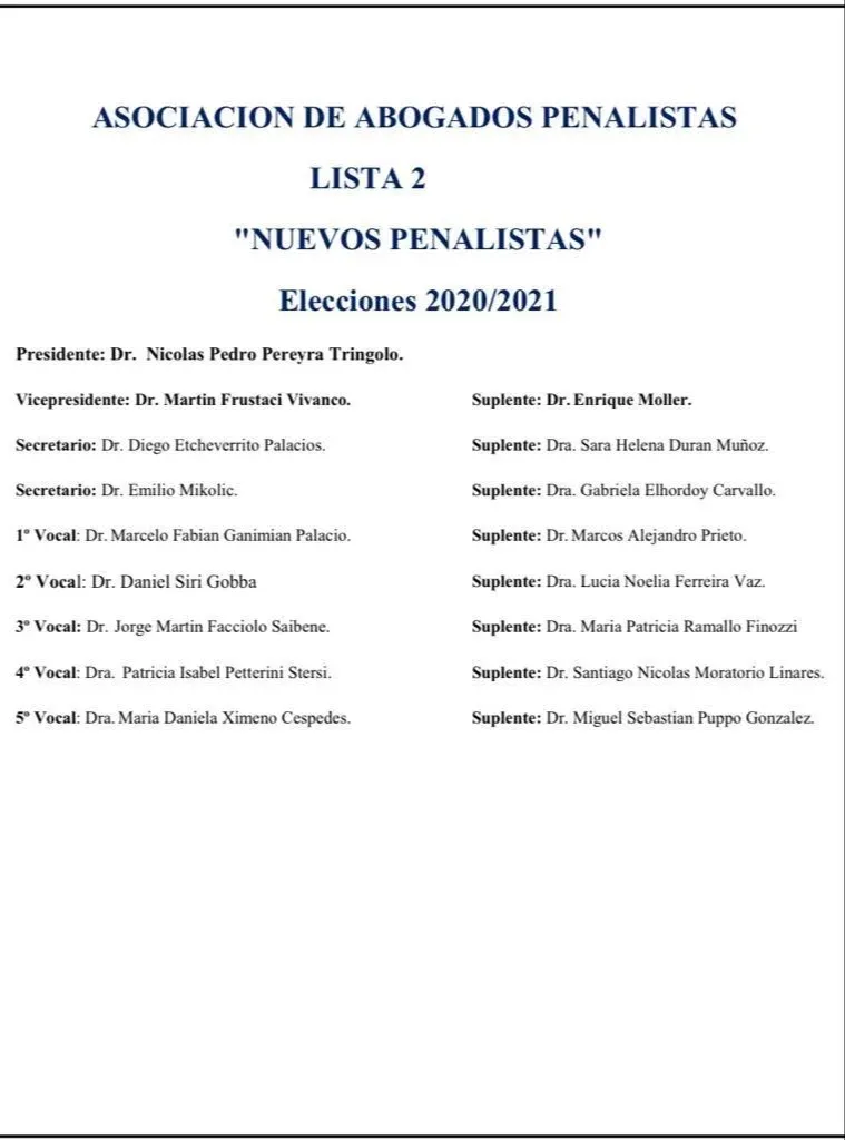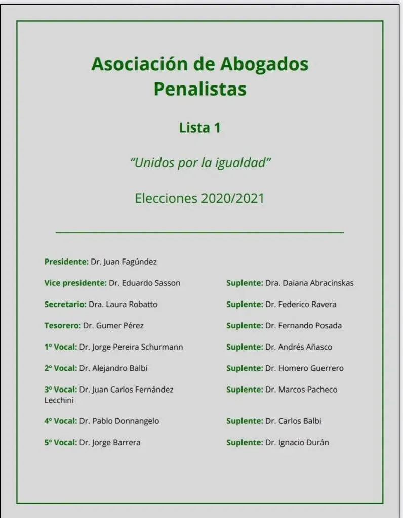 La Asociación de Abogados Penalistas se formó en setiembre y este martes elige autoridades en una votación que se realizará por correo electrónico, supervisada por una comisión electoral. La directiva quedará armada entre dos listas que compite: la 1 “Unidos por la igualdad”, considerada “oficialista” porque ya varios de sus integrantes integran la directiva provisoria, y la 2 “Nuevos Penalistas”.