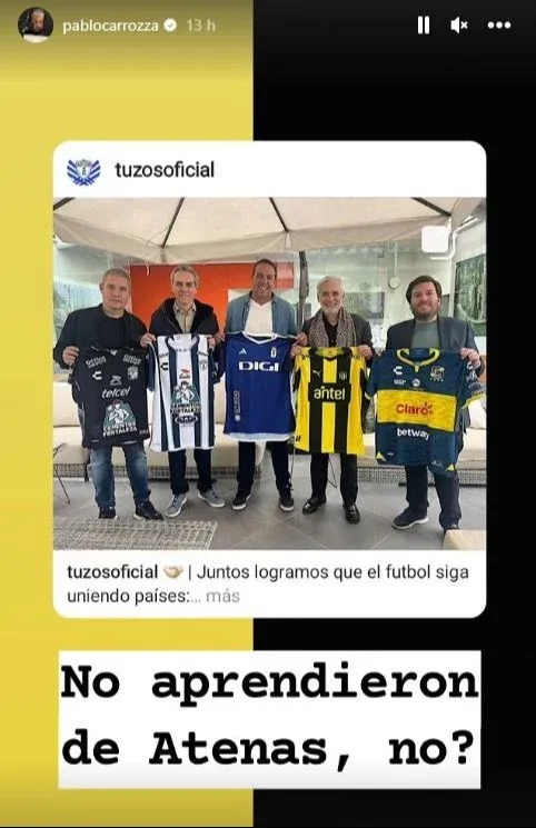 El mensaje de Pablo Carrozza Su mensaje refiere al proyecto que el Grupo Pachuca tuvo hace unos años al instalarse en Atenas de San Carlos, que fue cortado por el grupo antes del tiempo previsto, lo que no cayó bien en la institución de Maldonado.