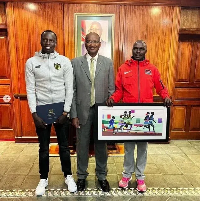 Instagram Emmanuel Korir con la campera de Peñarol “El presidente del Banco Central de Kenya le da entrega de un reconocimiento a la trayectoria deportiva al atleta más veloz del planeta en 800m”, señalaron.