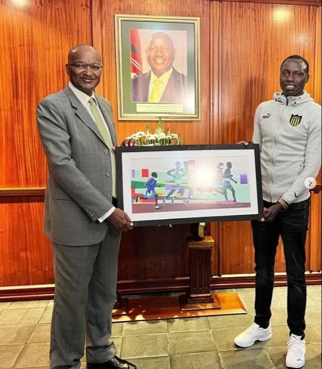 Con una campera de Peñarol gris con el escudo amarillo y negro, el atleta keniata Emmanuel Korir, el mejor corredor de los 800 metros actualmente en el mundo, recibió un premio en su país.