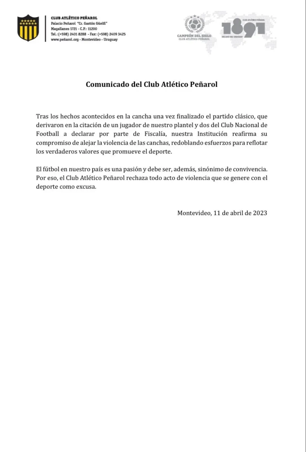 "Tras los hechos acontecidos en la cancha una vez finalizado el partido clásico, que derivaron en la citación de un jugador de nuestro plantel y dos del Club Nacional de Football a declarar por parte de Fiscalía, nuestra Institución reafirma su compromiso de alejar la violencia de las canchas, redoblando esfuerzos para reflotar los verdaderos valores que promueve el deporte. El fútbol en nuestro país es una pasión y debe ser, además, sinónimo de convivencia. Por eso, el Club Atlético Peñarol rechaza todo acto de violencia que se genere con el deporte como excusa", fue el breve comunicado emitido por el club.