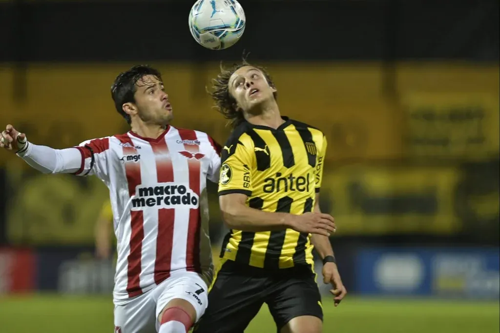 Marcos Montiel y Agustín Canobbio luchan por la pelota en las alturas