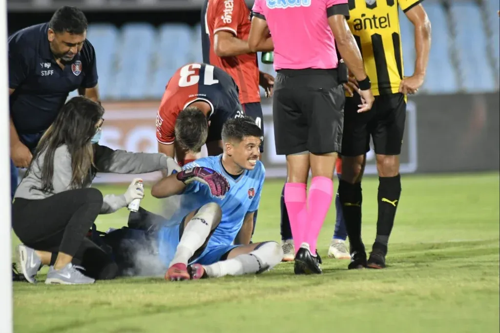 Yonatan Irrazábal es atendido por la sanidad de Albion; el arquero fue la gran figura del partido ante Peñarol