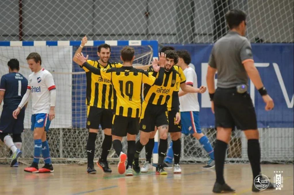 Los jugadores de Peñarol celebran uno de los seis tantos ante Nacional en el clásico de fútbol sala
