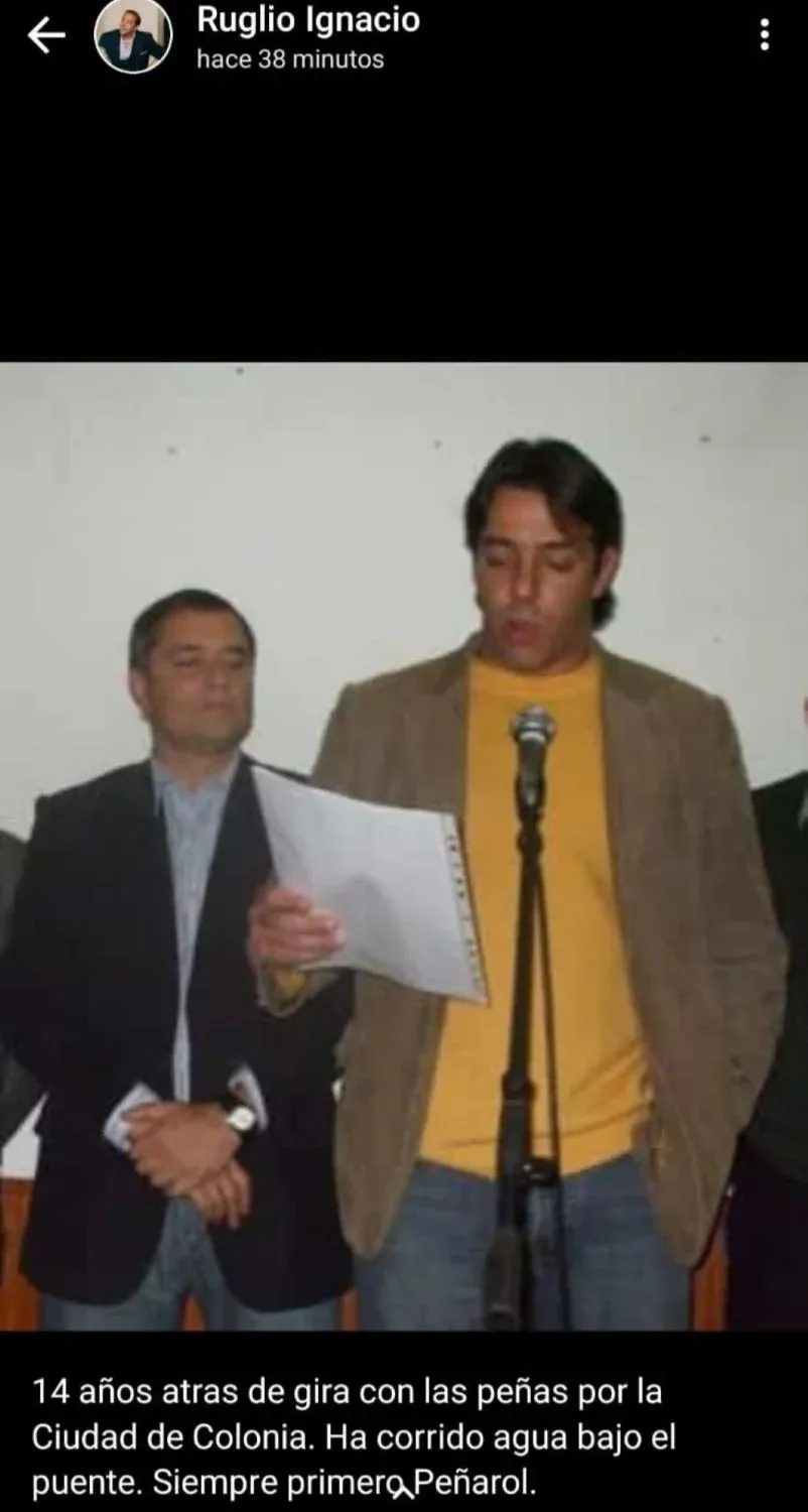 "14 años atrás de gira con las peñas por la ciudad de Colonia. Ha corrido agua bajo el puente. Siempre primero Peñarol", escribió Ruglio en la fotografía que subió a su estado de Whatsapp.