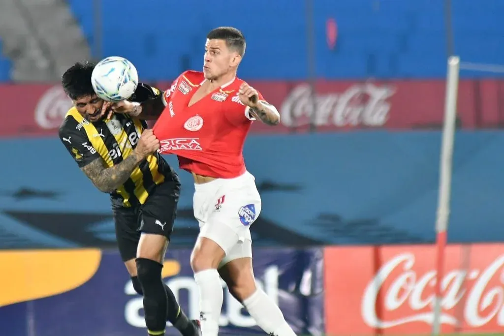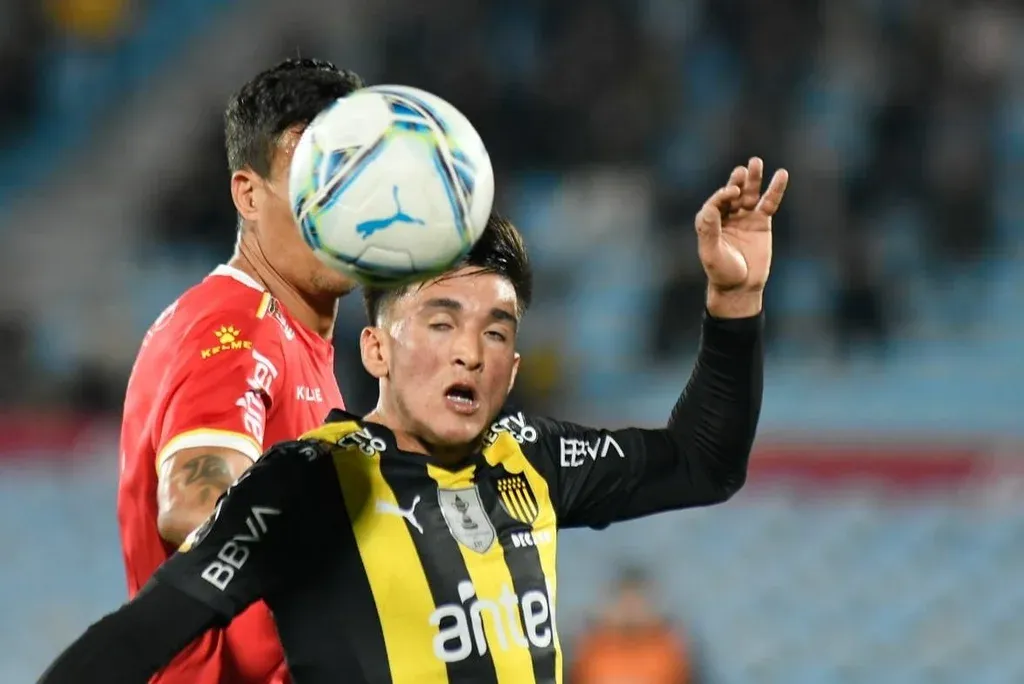 Ruben Bentancourt de Peñarol lucha por la pelota con Gonzalo Godoy