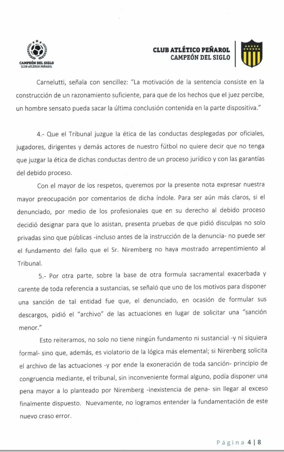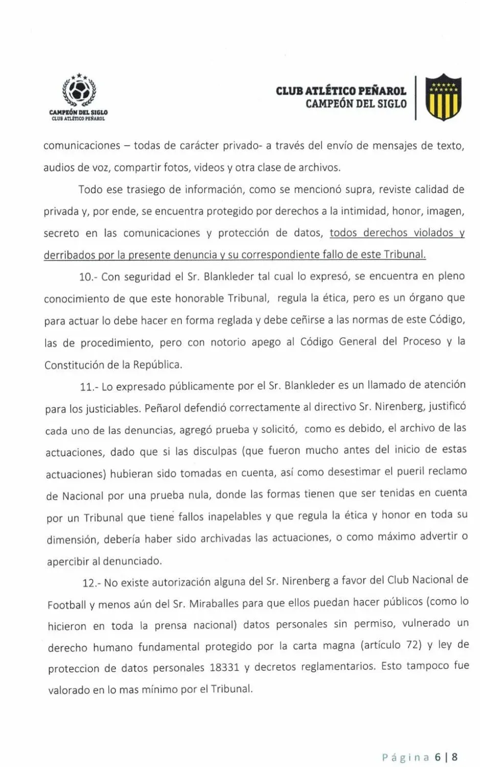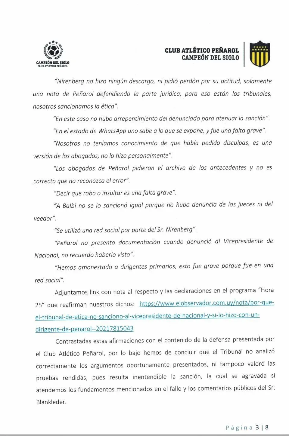 También expresaron que el miembro del Tribunal Ismael Blankleider "pretendió dar explicaciones del fallo naufragando soberanamente" cuando explicó por qué Nirenberg fue sancionado y por qué el vicepresidente de Nacional Alejandro Balbi no lo fue en ocasión del clásico del Torneo Intermedio 2020 cuando declaró "me sentí robado" tras la derrota 3-2 ante Peñarol en el Campeón del Siglo.