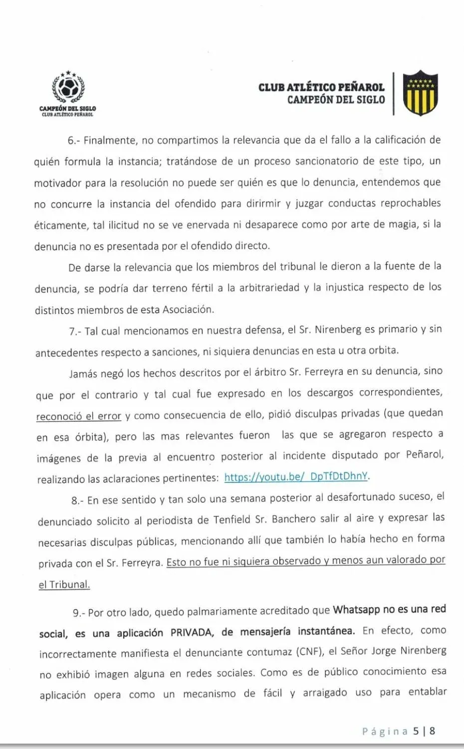 "Como incorrectamente manifiesta el denunciante contumaz (CNF) Nirenberg no exhibió imagen alguna en redes sociales", expresó Peñarol en su escrito dando a entender que la conducta de denunciar de Nacional es pertinaz.