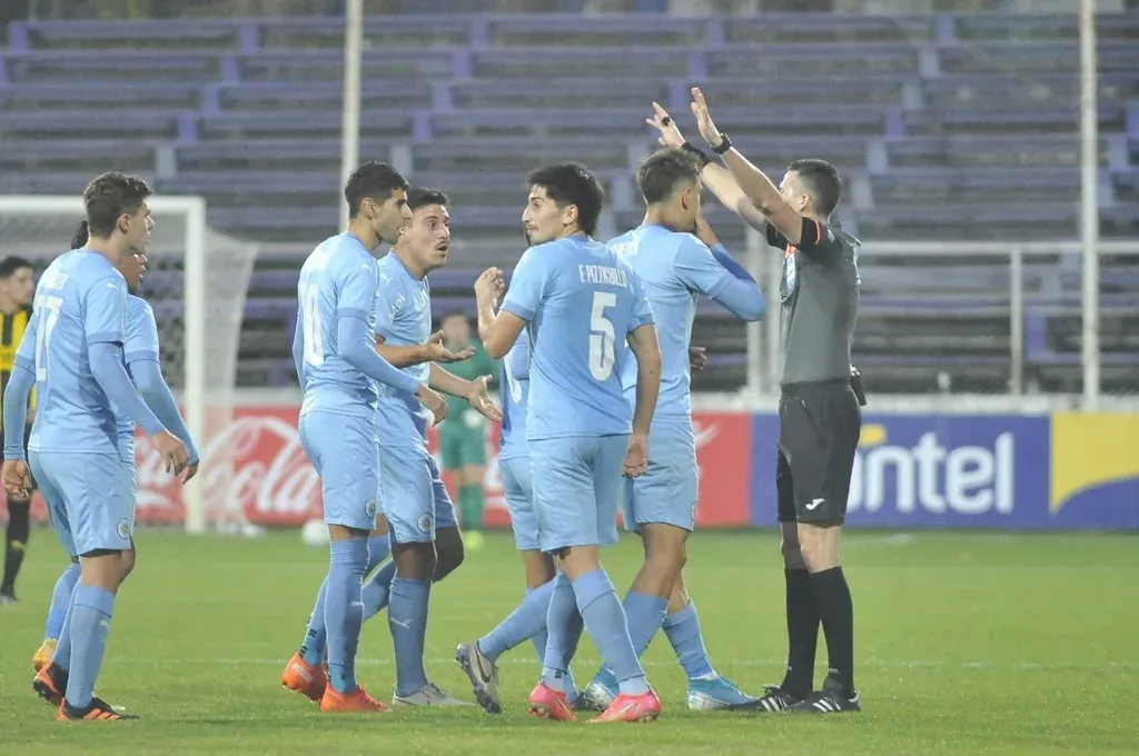 Los jugadores de Montevideo City Torque protestan por el segundo gol que le anuló Andrés Matonte
