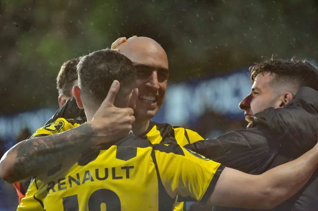Ariel Nahuelpán celebra el triunfo ante Torque con sus compañeros de Peñarol