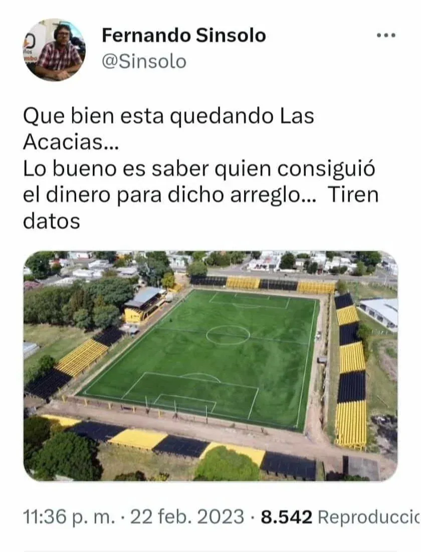 “Qué bien está quedando Las Acacias… Lo bueno es saber quién consiguió el dinero para dicho arreglo. Tiren datos”, escribió Sinsolo en un tuit que luego borró, pero cuya captura de imagen circula en la red.