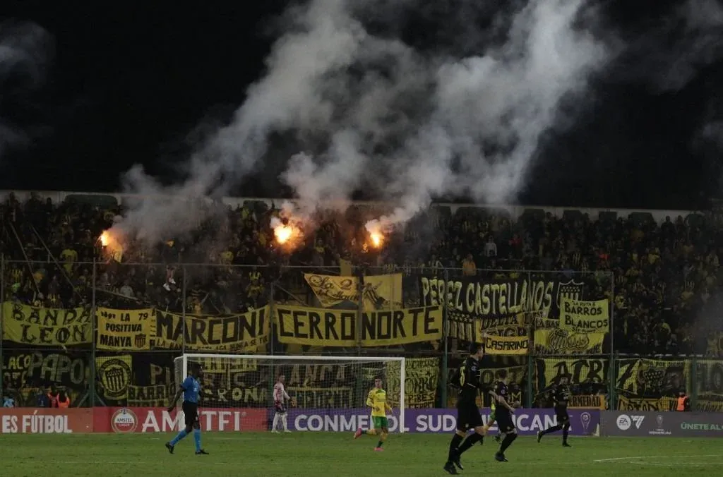 Además, los hinchas aurinegros lanzaron bengalas al campo de juego en el comienzo del segundo tiempo, lo que llevó al juez brasileño José Argote a detener el partido para que sean apagadas y retiradas.