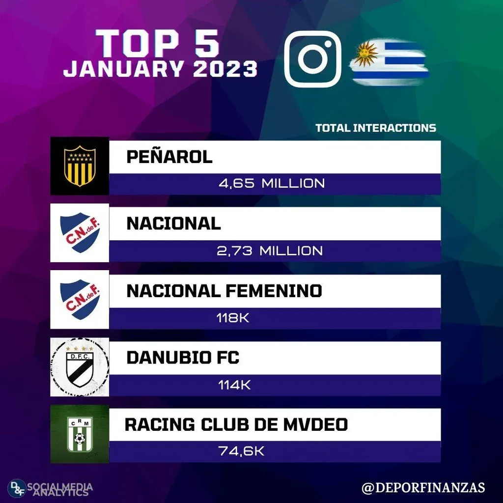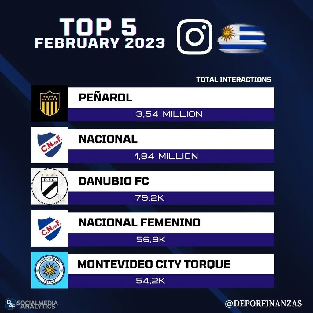 En febrero, Peñarol también lideró en Instagram con 3,54 millones. Nacional tuvo 1,84 millones de interacciones mientras que Danubio, el femenino de Nacional y Montevideo City Torque completaron el top 5.