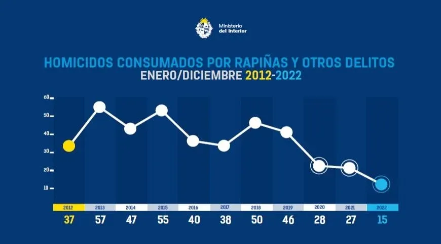 El gobierno destacó que hubo solamente 15 homicidios derivados de rapiñas en 2022, la cifra más baja desde 2012, cuando fueron 37. Cuando lo presentaba, el ministro adelantó que era una cifra que –junto a la cantidad de víctimas de homicidios con antecedentes penales– es cuestionada por la oposición y otros actores.