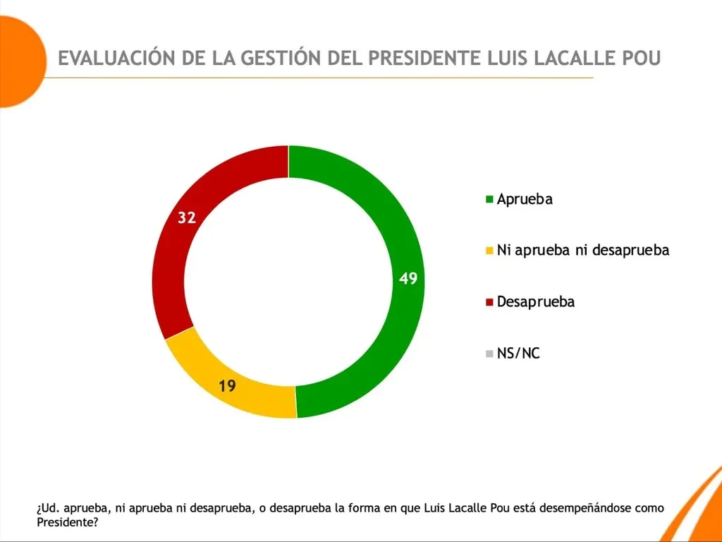 La aprobación es de 49%, la desaprobación de 32% y los juicios intermedios se mantienen en 19%. El saldo neto que recibe Lacalle Pou es de +17.