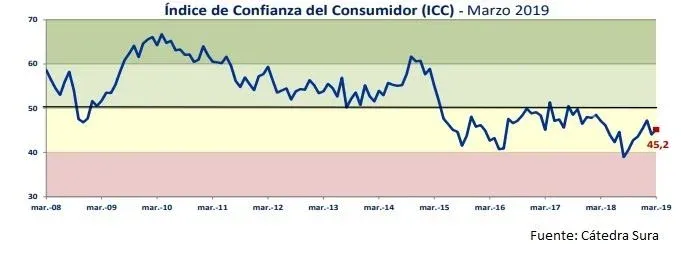 El ICC elaborado por la Cátedra Sura de Confianza Económica de la Universidad Católica y Equipos Consultores se ubicó en 45,2 puntos en el tercer mes del año y recuperó parte de lo perdido en febrero. Igualmente, en el primer trimestre del año la confianza está 2,3 puntos por debajo de igual período de 2018.