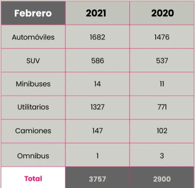 De acuerdo a los datos que divulgó la Asociación del Comercio Automotor (ACAU), en febrero se colocaron 3.757 vehículos 0 km en todas sus categorías en el mercado, más de 800 unidades por arriba de igual mes del año pasado (2.900) y un número muy similar a enero (3.732). Cabe precisar que febrero suele tener menos jornadas hábiles por los feriados de carnaval y porque este año tuvo 28 días.