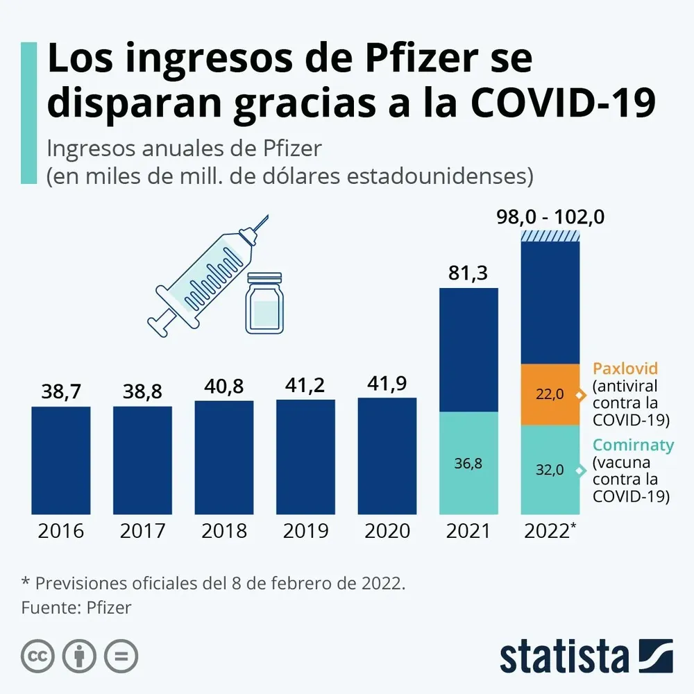 Para 2022, la multinacional estadounidense prevé US$ 32.000 millones en ventas de su vacuna Comirnaty, además de US$ 22.000 millones en ventas de Paxlovid, su medicamento antiviral oral contra el covid-19. Ambas estimaciones se basan en los contratos que el laboratorio tenía firmados a finales de enero, por lo que las cifras podrían ajustarse al alza en el transcurso del año.