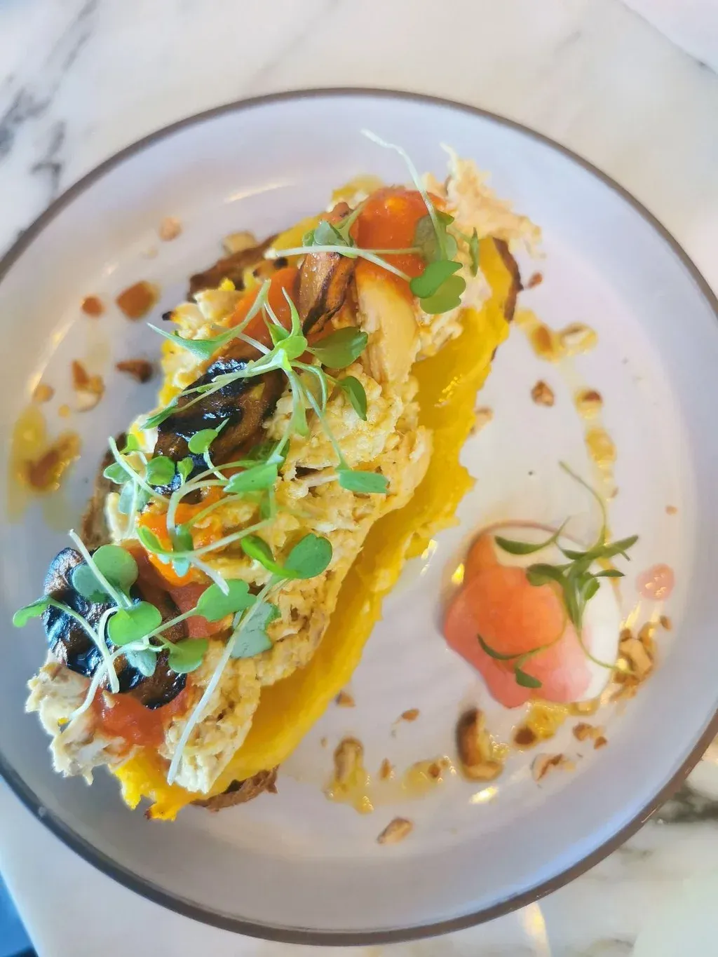 pan de masa madre que no pierde su crocante, se extiende una capa de puré de calabaza especiado y una segunda de pollo al curry. Además, es una caricia para la mirada.