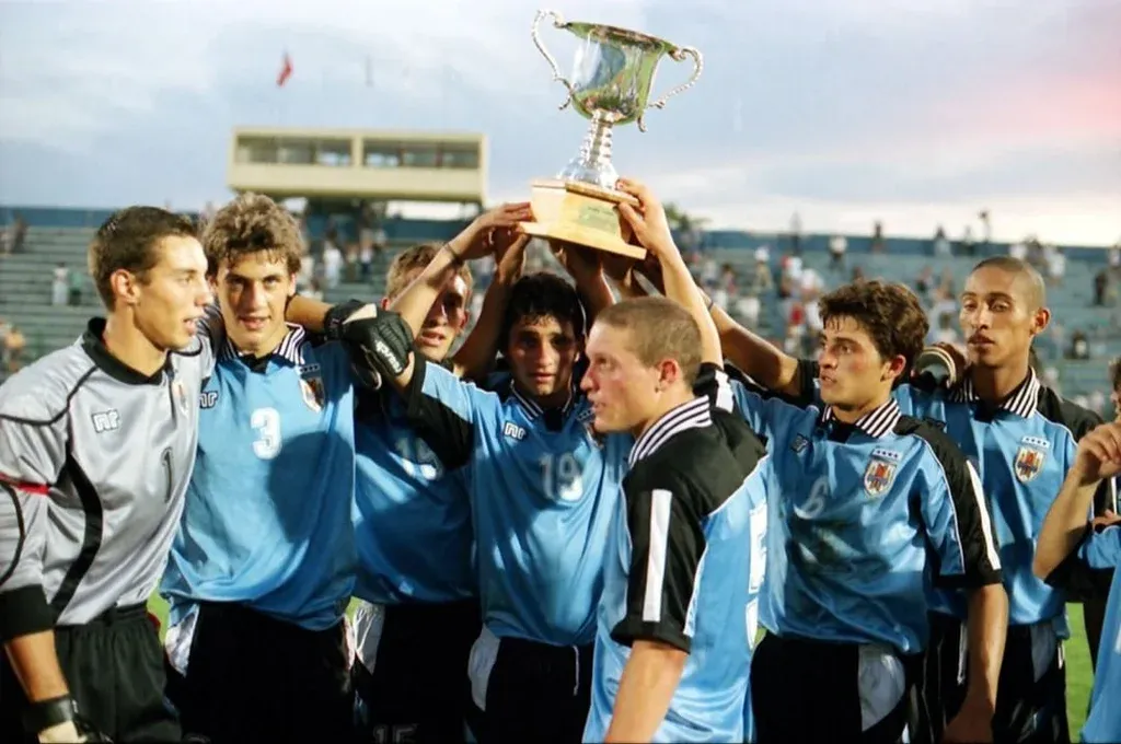 Una copa ganada con la selección uruguaya sub 20; aparece Fabián Carini, Gonzalo Sorondo, Carlos Bueno, el Ruso Diego Pérez y Alejandro Correa Rodíguez, entre otros