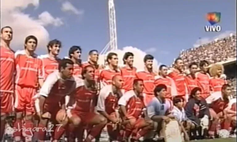 Carini al lado del Pibe Valderrama, arriba a la derecha, en la despedida de Maradona del fútbol