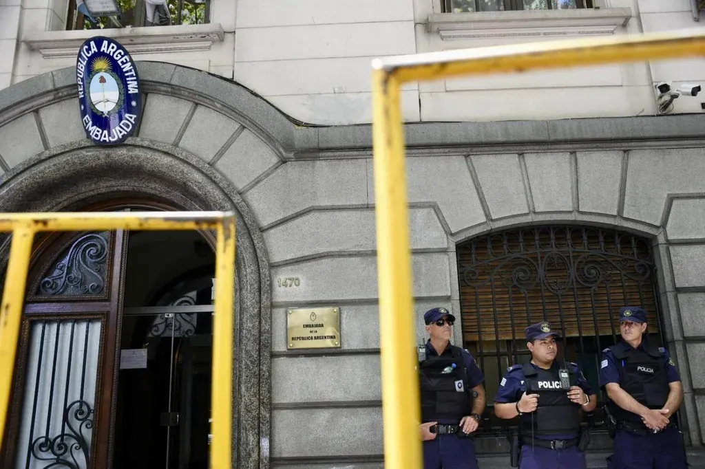 El PIT-CNT se movilizó este miércoles frente a la Embajada Argentina en apoyo al paro nacional que convocaron los trabajadores de Argentina y en contra de las medidas que tomó el presidente Javier Milei.