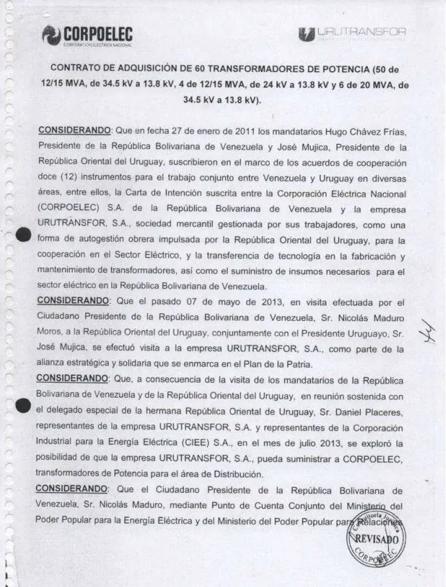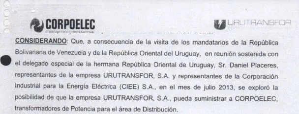 El documento señala que el 7 de mayo de 2013, el presidente venezolano, Nicolás Maduro, y el entonces presidente uruguayo José Mujica visitaron a la empresa Urutransfor “como parte de la alianza estratégica y solidaria que se enmarca en el Plan de la Patria”. El texto agrega que “a consecuencia de la visita de los mandatarios (…) en reunión sostenida con el delegado especial de la hermana República Oriental de Uruguay Sr. Daniel Placeres, representantes de la empresa Urutransfor y representantes de la Corporación Industrial para la Energía Eléctrica (CIEE) en el mes de julio 2013, se exploró la posibilidad de que la empresa Urutransfor pueda suministrar a Corpoelect transformadores de potencia para el área de distribución”.
