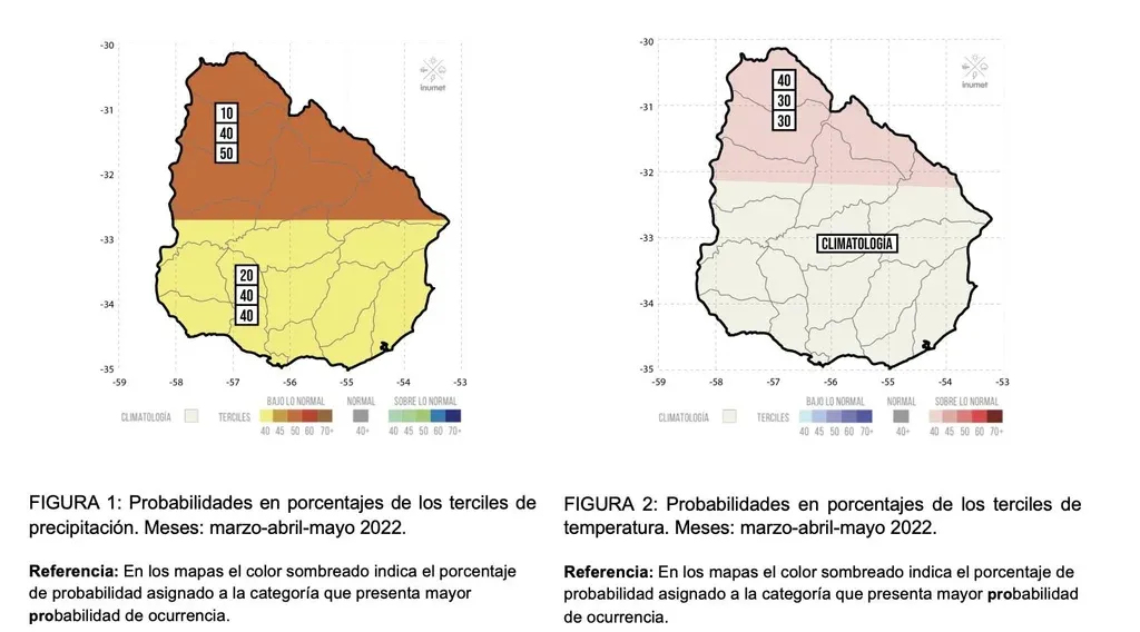 Según el informe de tendencias climáticas que realiza El Instituto Uruguayo de Meteorología (Inumet) la precipitación acumulada esperada para- abril - mayo es normal o inferior a lo normal. En particular, se divide el país en dos regiones: