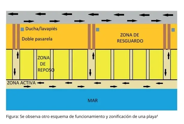 Se insiste en recomendar la distancia física sostenida en todas las áreas. Además de la delimitación de las zonas, se sugiere circular por la mano derecha para quienes vayan caminando y definir lugares para entrar y salir de la playa, de modo que se eviten los cruces de las personas que llegan y se van del lugar.
